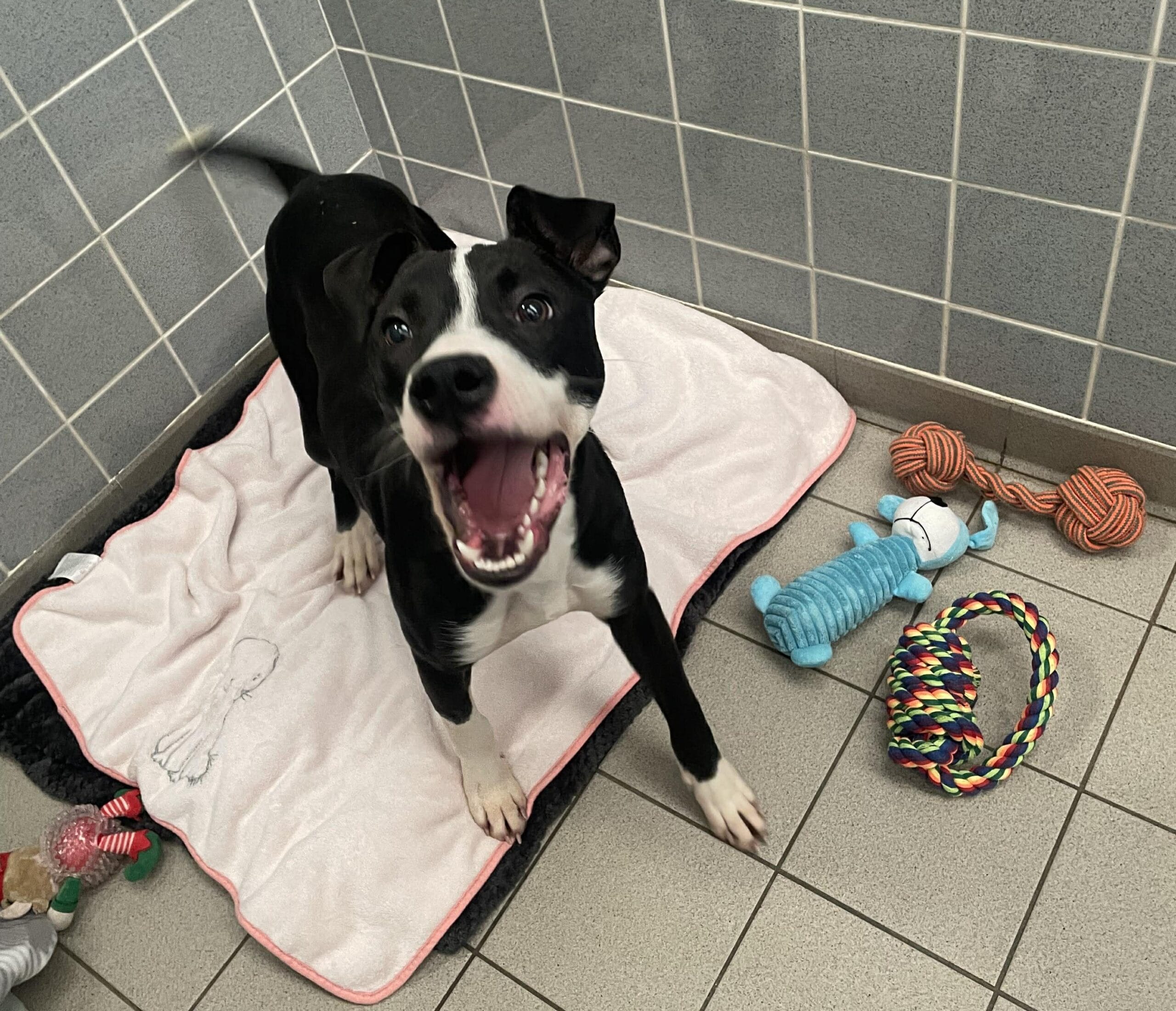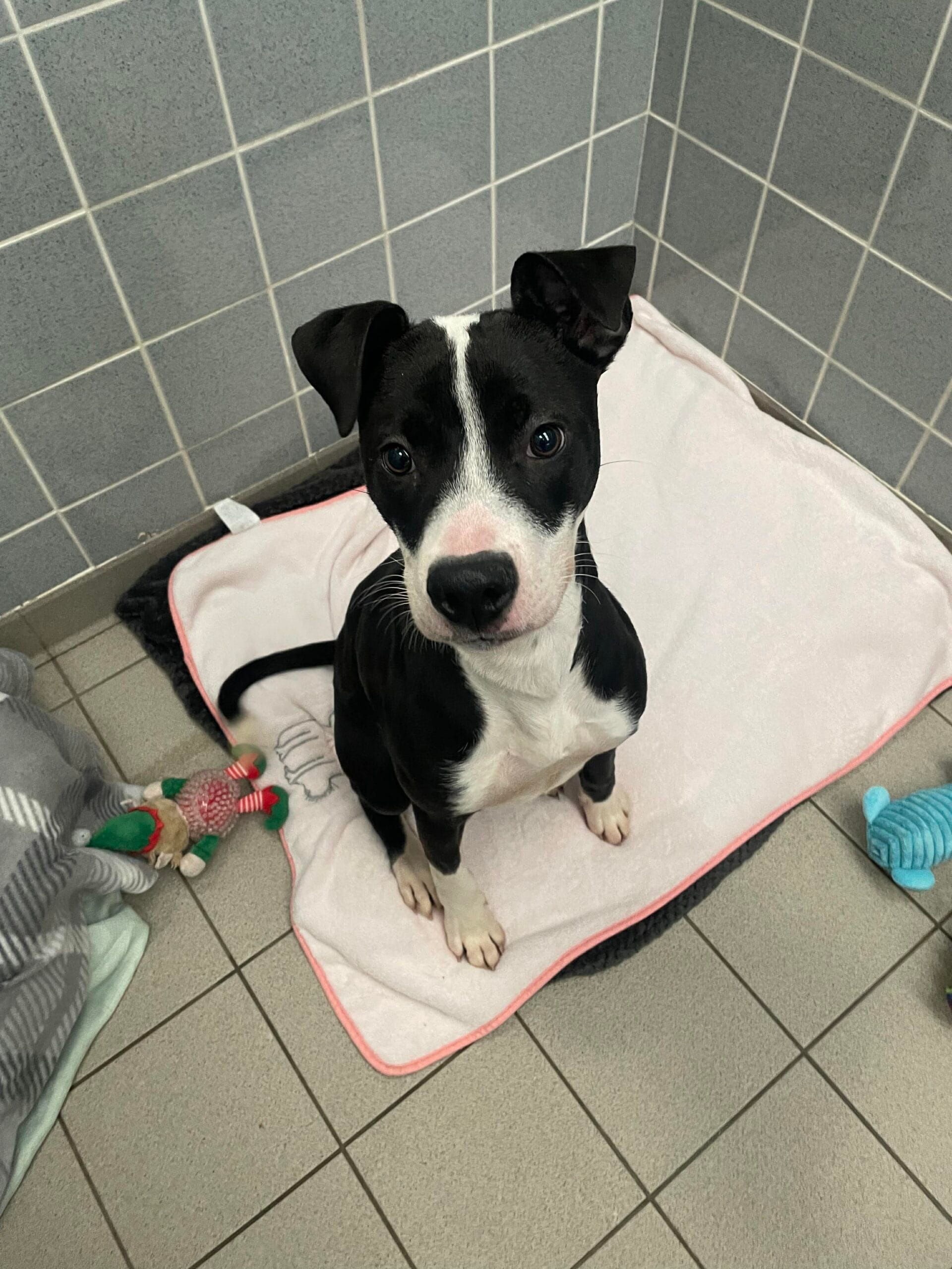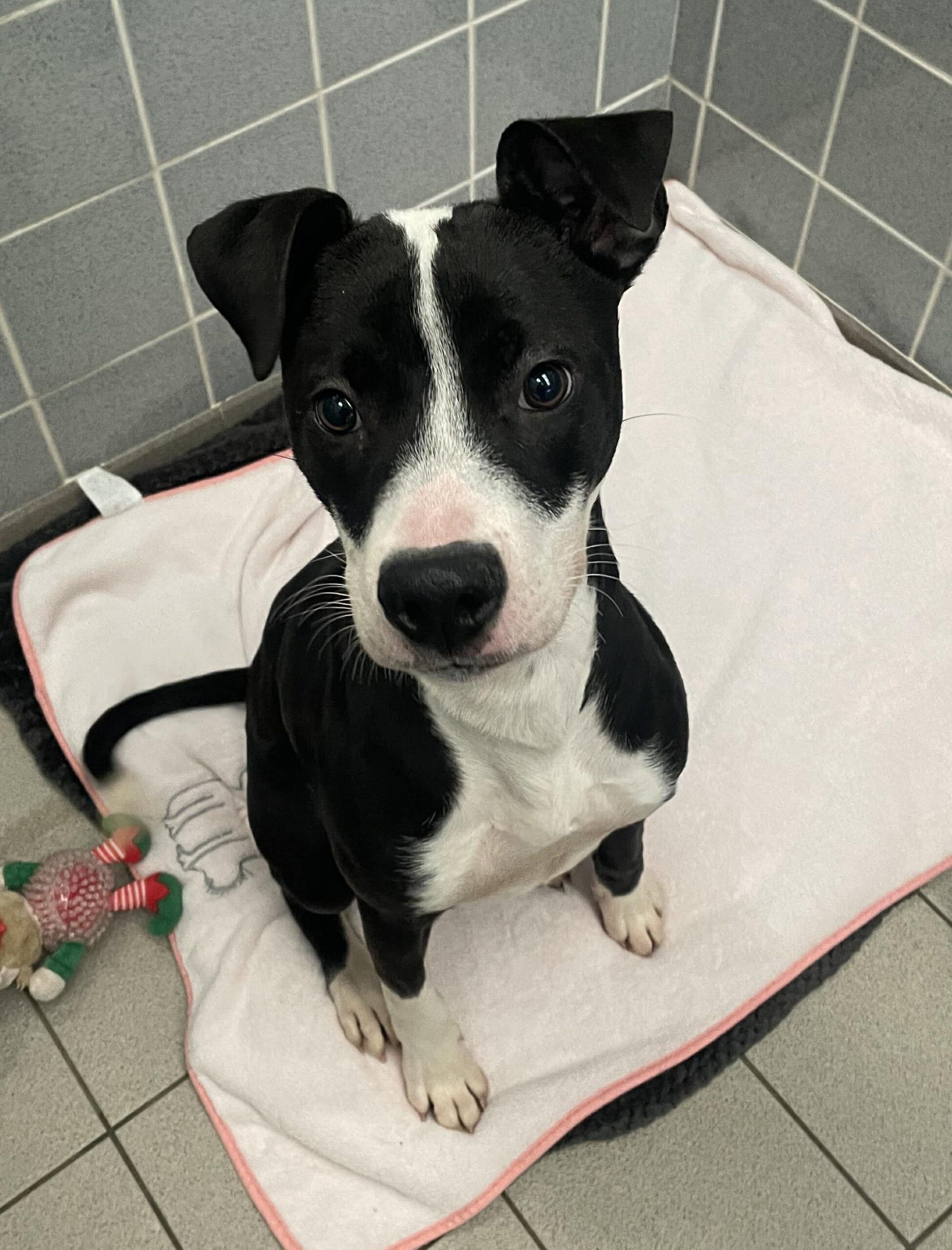 Meet Ebony!  Ebony can be quite timid and unsure around new people but once she has got to know you she is a very lively and bouncy girl that is bursting with energy.  She loves chasing around our compound with her toys and going on long walks. Ebony will need continued training and socialisation as she is still a very young girl with lots to learn. She would benefit from puppy training classes. Ebony has socialised well with other dogs whilst in our care and is very playful so we feel following a successful meet and greet she could be rehomed with another energetic dog.