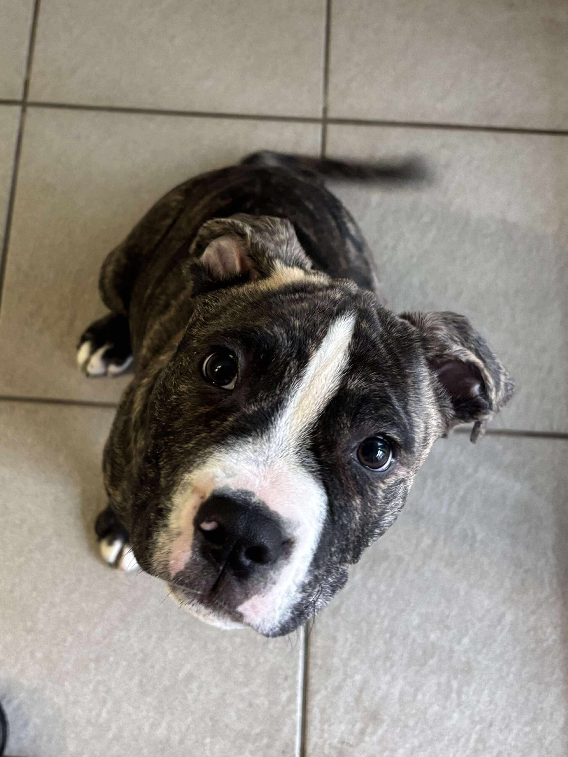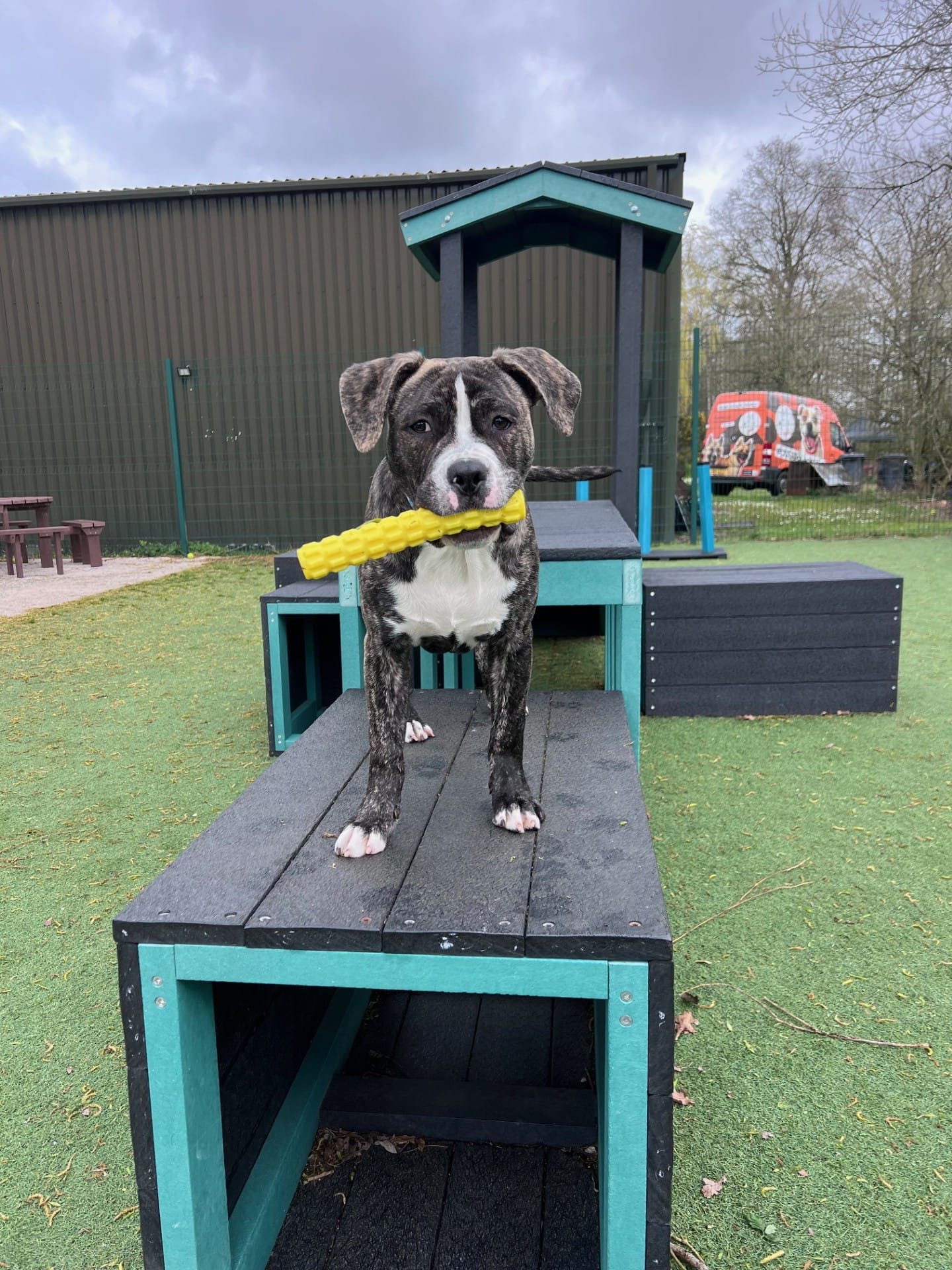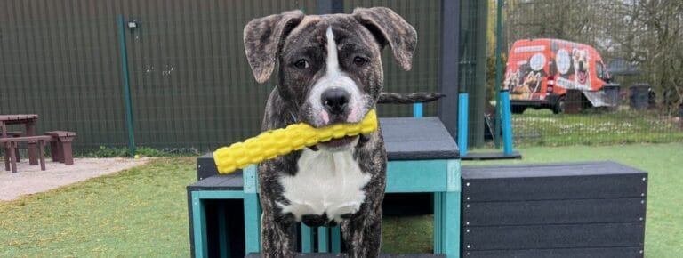 He is full of energy and has typical traits of a puppy including mouthing when he gets too giddy! He is still only a young pup so he will need a family that is happy to work on puppy training, toilet training and socialisation. Marc has been such a lovely boy since being with us and hasn’t had the best start to his life! He is such a happy boy to be around and loves to play with his toys – he just needs someone to play with!