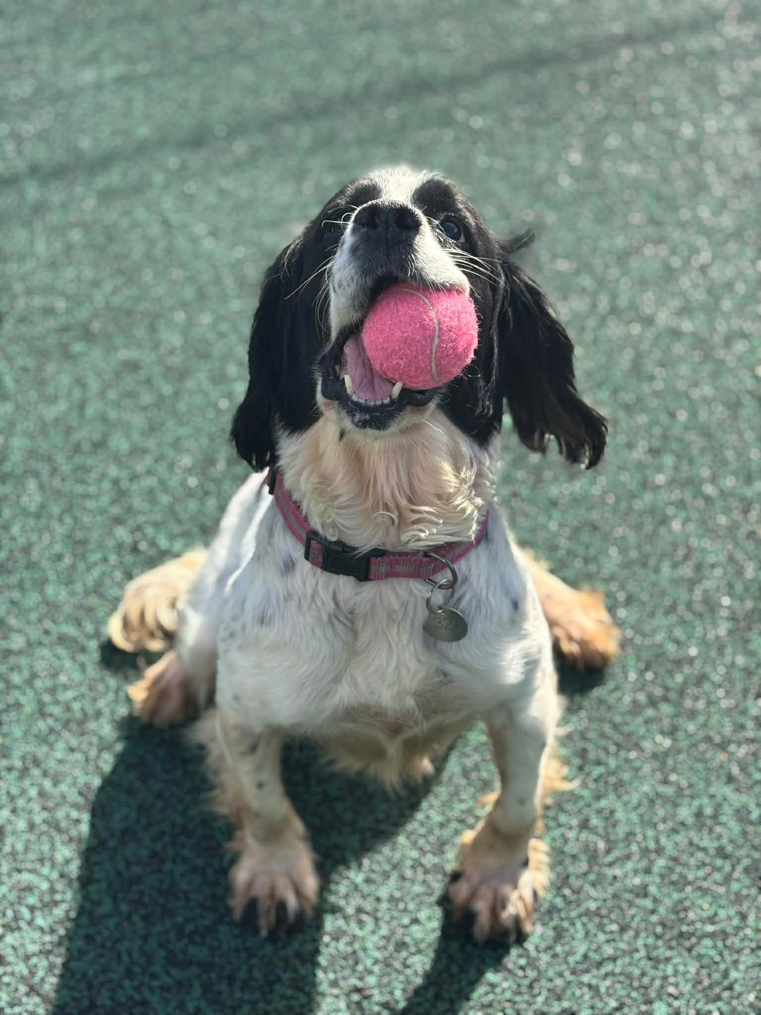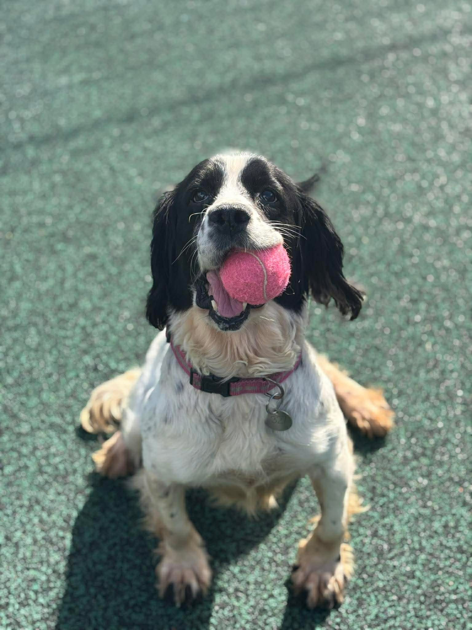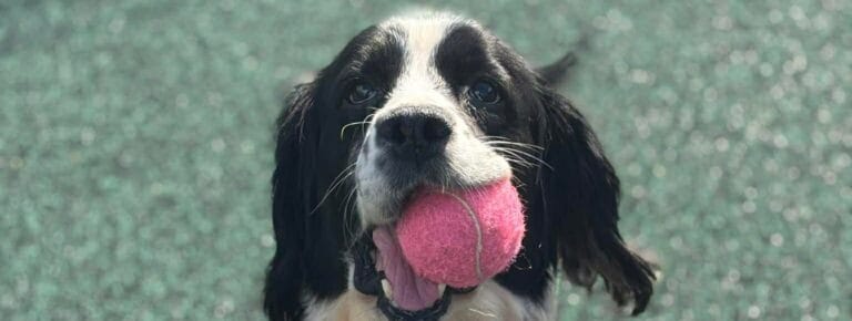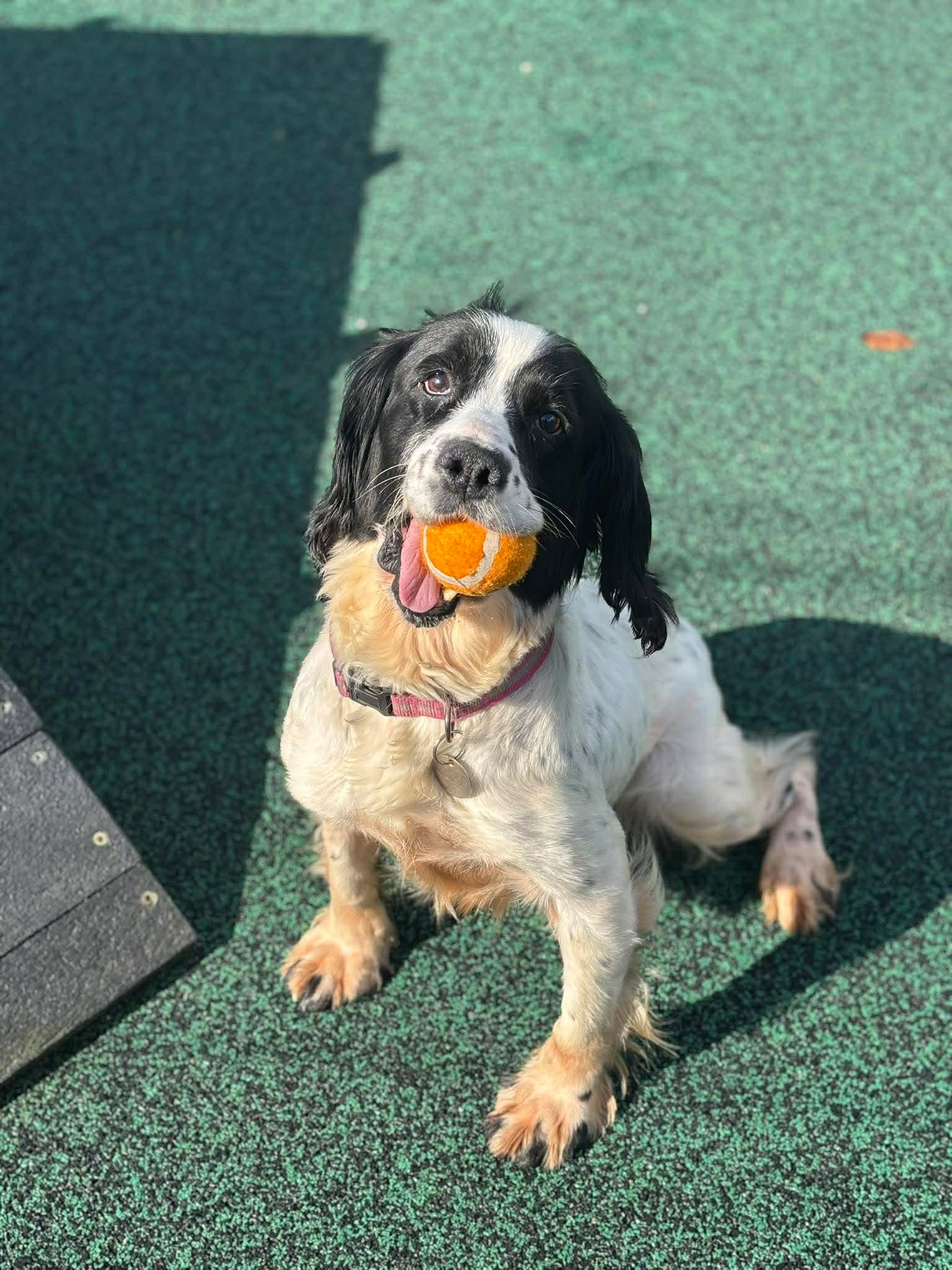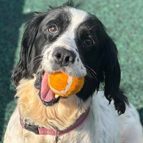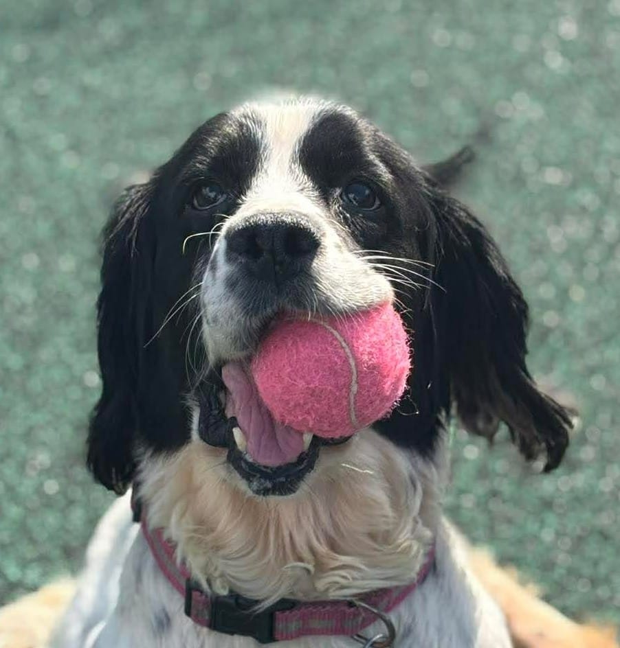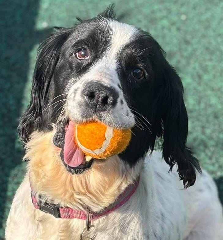 She is such a friendly girl and her tail is constantly wagging. As you can imagine with a Spaniel she is toy obsessed and will chase them around all day, in fact it was very difficult to get any pictures of her without a toy in her mouth! We are looking for an active home for Nelly where she can go on lots of adventures and get plenty of exercise and mental stimulation. Nelly has socialised with other dogs whilst in our care and will have a sniff at them and walk away, she much prefers human attention so for this reason we would like her to be the only dog in the home where she can get 100% of the attention and doesn’t have to worry about sharing her toys!