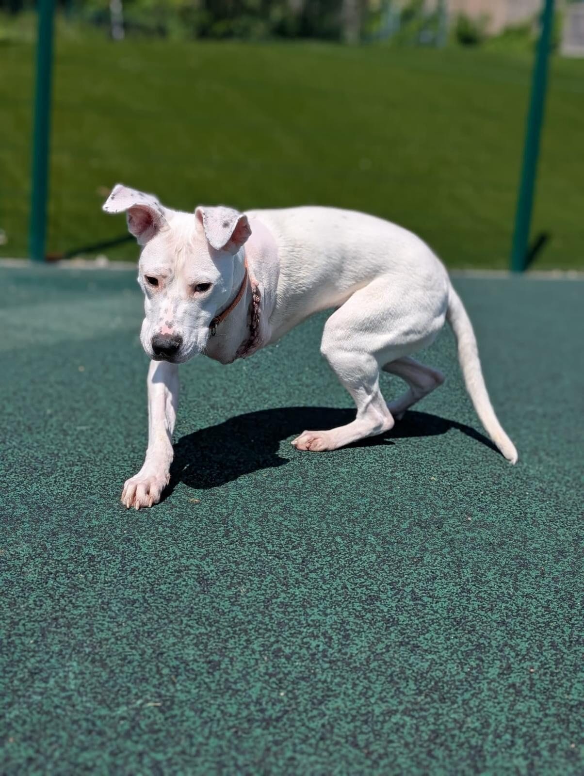 When Hattie came to us, it was clear her front leg was badly deformed, probably the result of an old, untreated fracture in her carpus (Ankle) She’d likely lived with that pain for some time, and every step was a struggle, but she never gave up. She still wagged her tail. She still trusted.